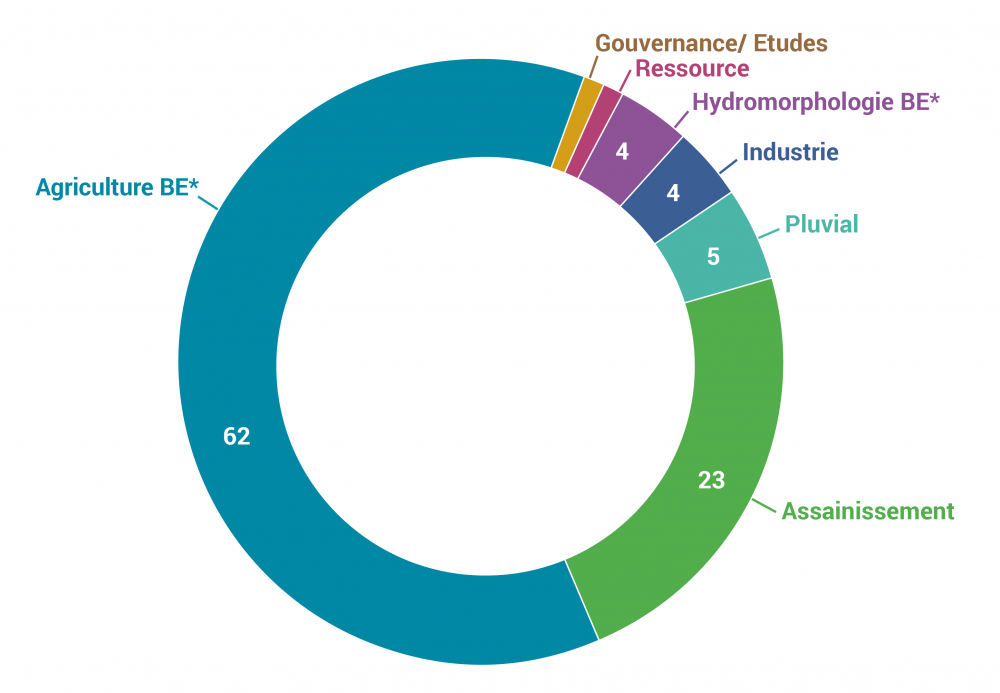 Au regard de la répartition qui serait nécessaire pour l’atteinte de ces objectifs, le volet agricole nécessiterait 62% de cette somme pour atteindre le bon état (soit 9,3 milliards d’euros), ce qui représente un montant près de 9 fois supérieur au montant disponible (1,04 milliards d’euros).